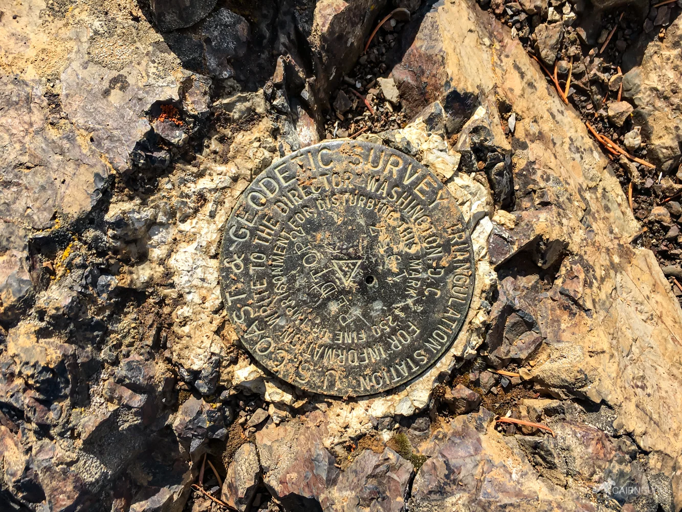 There are at least four Geodetic survey markers near the lookout. Two are on top of the rock just north of the lookout. One is underneath the lookout and the fourth is to the north of the lookout a few feet. There may be more.
