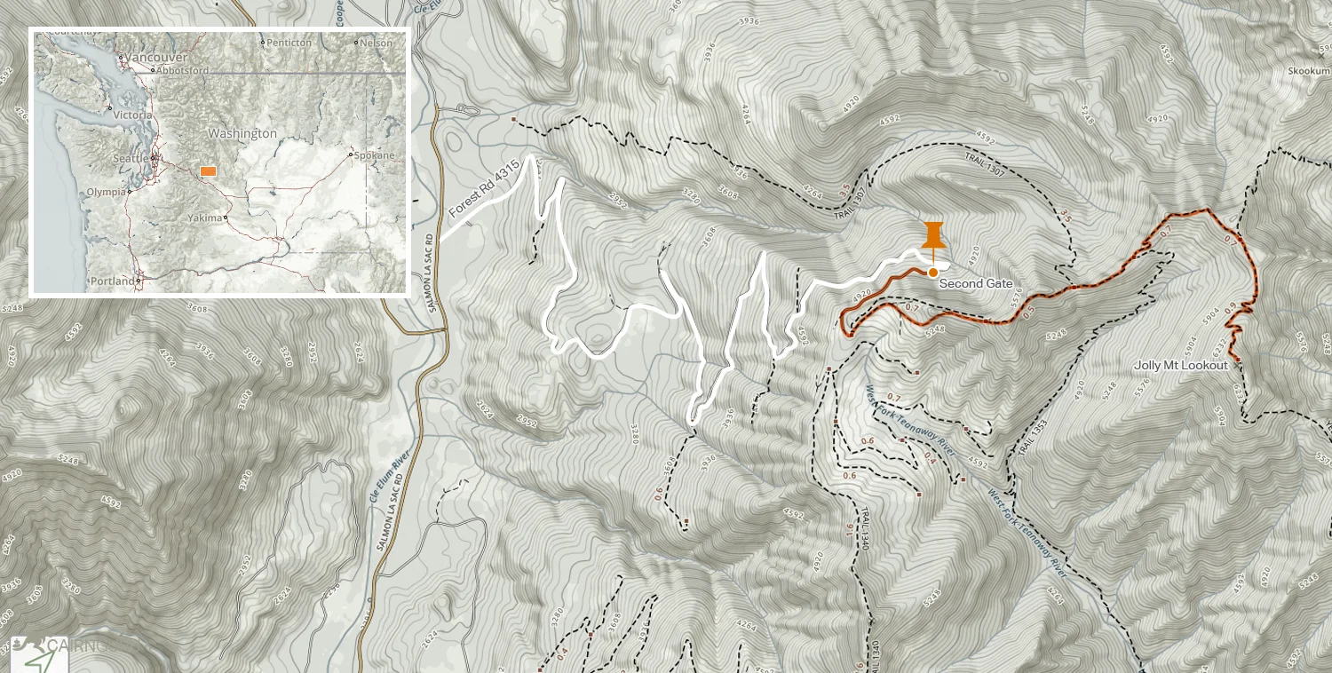 There's a dedicated trail (1307) to Jolly Mountain that begins at the Cayuse Horse Camp in the Salmon La Sac area north of Cle Elum Lake. It's a 9.1 mile trail and this time of year the trail conditions are going to be iffy. I decided to try the "short-cut" by taking Forest Road 4315 if it was open. There are two gates on this road and I have no idea why they are open sometimes and closed at other times. The last time I was here they were closed... but not this time!